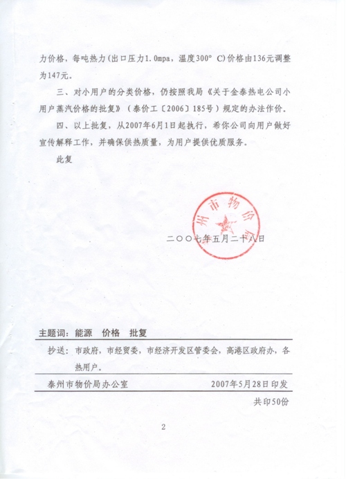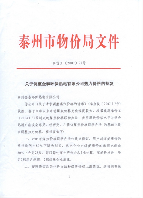 关于调整乐投·体育环保热电有限公司热力价格的批复